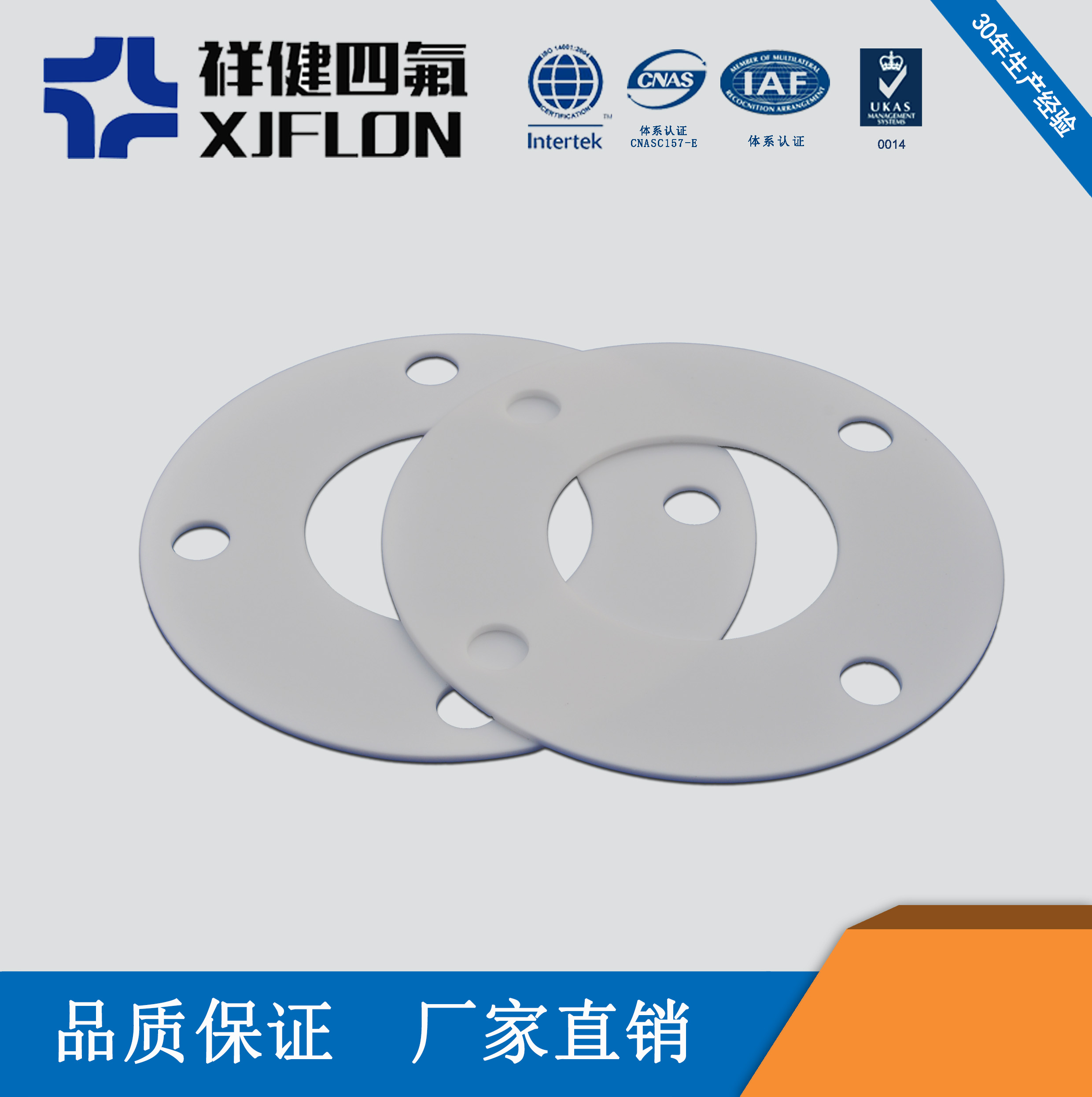 此外,法蘭形式不同、法蘭表面粗糙度對密封效果影響很大,特別是當采用非軟質墊片時,密封表面粗糙的度值大是造成泄露的主要原因之一。例如,車削法蘭面的刀紋是螺旋線,使用金屬墊片時,如果粗糙度值較大,墊片就不能堵死刀紋所形成的這條螺旋槽,在壓力作用下,介質就會順著這條溝槽泄漏出來。軟質聚四氟乙烯墊片對法蘭面的光潔程度要求低很多,這是因為,它容易變形,能夠堵死加工刀紋,從而防止了泄漏。對軟質聚四氟乙烯墊片,法蘭面過于光滑反而不利,因為此時發生界面泄露阻力變小了。下面是祥健四氟生產的四氟墊片的性能參數。